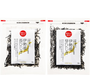 国内産の中でも希少な「伊勢産ひじき」を使用しています。三重県伊勢志摩地区は太平洋からの黒潮の分流と、山からの栄養分が流れ込む豊かな海が広がります。荒波にもまれた天然の伊勢産ひじきは身が太く長く成長し、煮物にした時に味をよく含ます。葉の部分を乾燥させた「芽ひじき」はふわっとほどけるような食感、茎を乾燥させた「長ひじき」はもっちりとした食感が特長です。収穫は3~5月の大潮の干潮時に岩場に出て手でていねいに刈り取ります。真空蒸煮釜を使いふっくらやわらかに炊きあげた後、乾燥させます。芽ひじきは水で戻すと10倍、長ひじきは6~7倍になります。煮物1人前(乾燥ひじき4g程度)で約45円程度と経済的にも優れています。