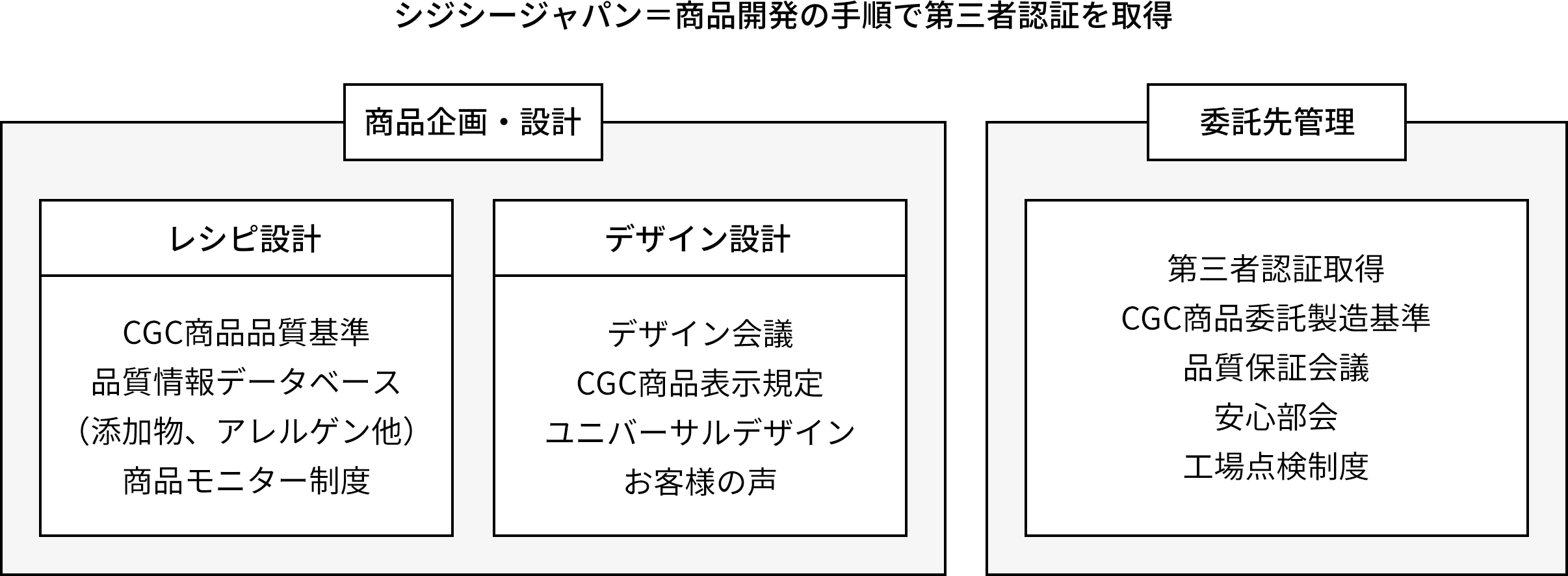シジシージャパンでは、開発商品の品質を保証するために様々な取り組みを行っています。PB商品の製造を委託するお取り組み先は、「安心・安全」に関する第三者認証を取得しているメーカー・工場に限定しています。同時に、企画・開発を行うシジシージャパンも第三者認証を取得することで、お客様に「安心・安全」な商品をお届けすることに努めています。